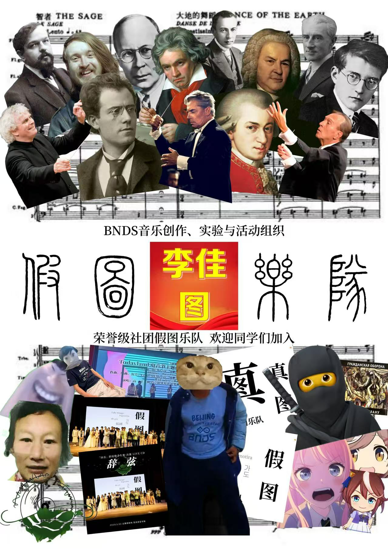 A: “假图“这个名字的来源相当随意,大概带着一点抽象和讽刺的意味。两位社长至今无法对这个神秘名称的含义作出准确解释。或许会有大儒为我们辩经,说它取自《红楼梦》中的“假作真时真亦假,无为有处有还无”,让“假图”平添一丝哲理。但我们认为这并不重要,“假图”这一名称也渐渐随着社团知名度的增长,成为了BNDS的某种抽象亚文化。
